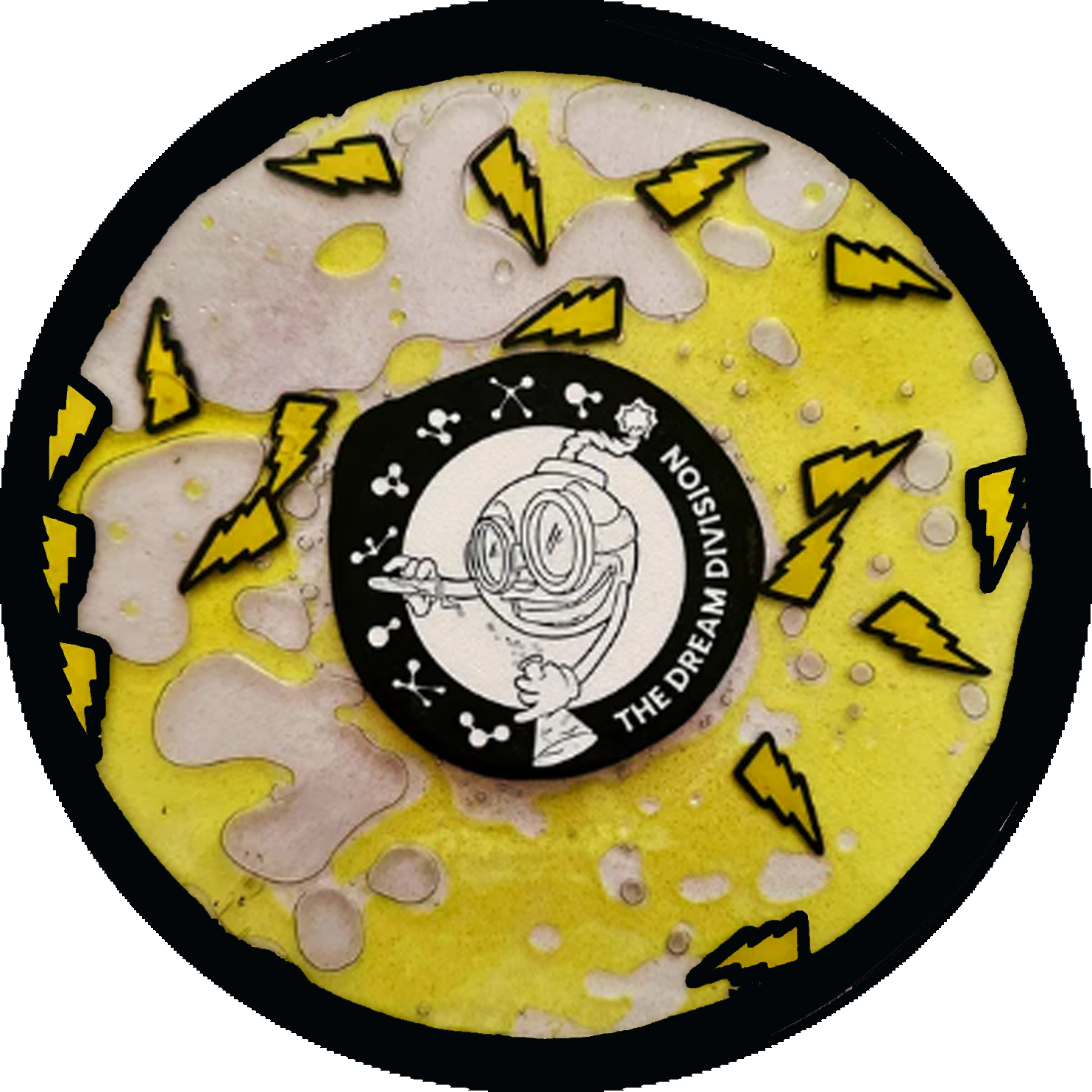 A circular object with a black and white sticker in the center, featuring a cartoon character with goggles and the text "THE DREAM DIVISION." Surrounding the sticker, there is a cream-colored surface with splashes of red and black liquid and small bl